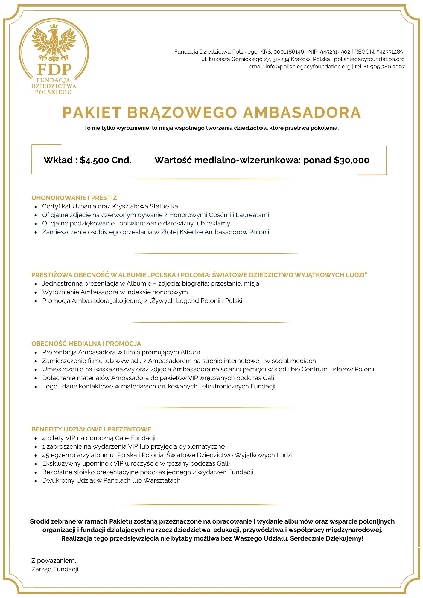 Ambasador to lider z misją, który swoją pracą, sukcesami i przykładem wpływa na otoczenie, budując mosty między przeszłością a przyszłością, między krajem a diasporą, między ludźmi różnych środowisk i pokoleń. Jest uosobieniem nowoczesnego patriotyzmu, odpowiedzialności obywatelskiej i troski o wspólne dobro.